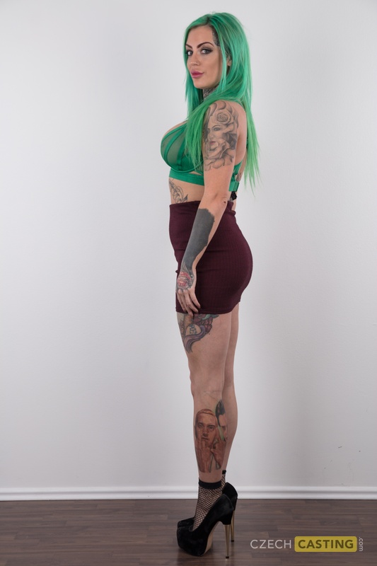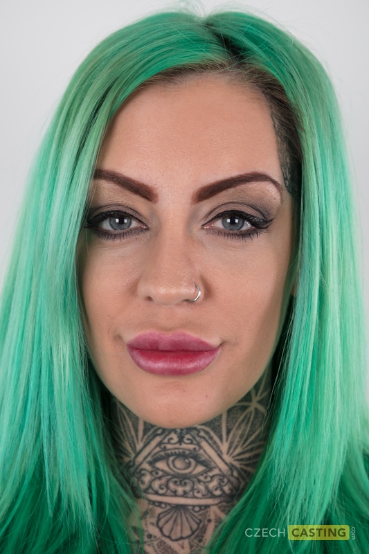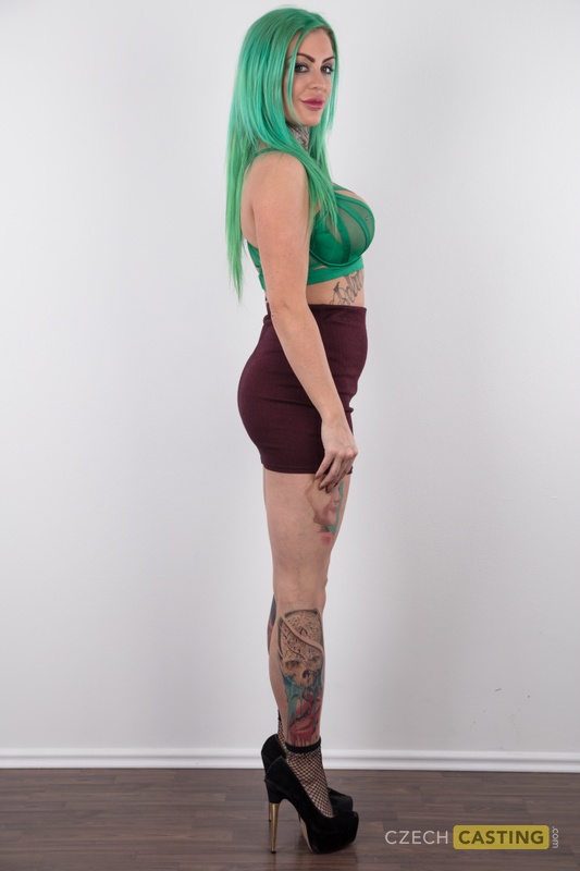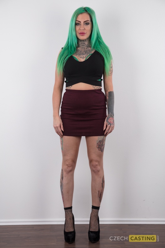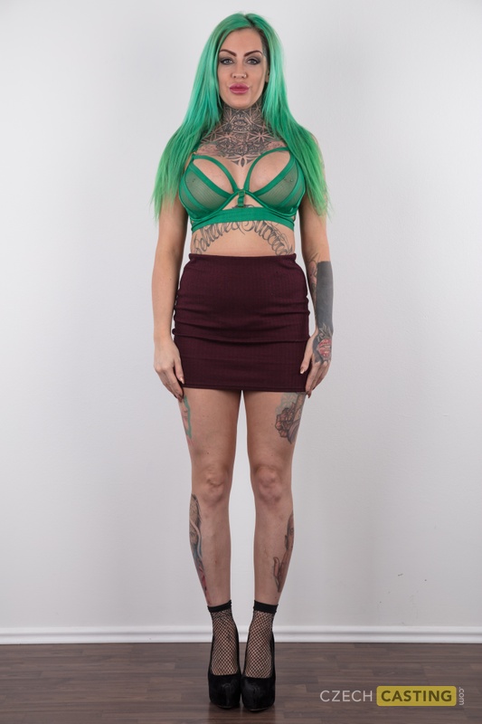 Фотосет Татуированная девушка с зелеными волосами и сосками с пирсингом стоит голой после раздевания в категории: